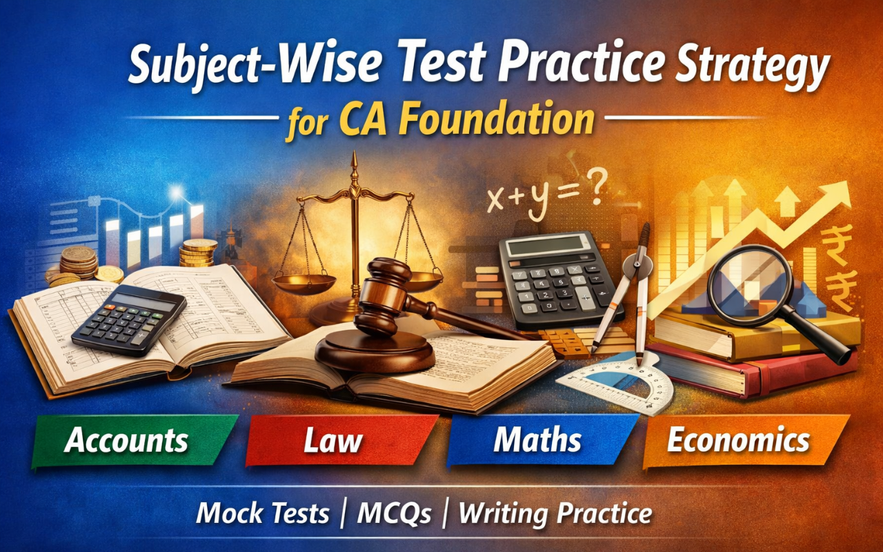 Subject-wise test practice strategy for CA Foundation covering Accounts, Law, Maths & Economics. Learn how to practice mocks and score higher in exams.